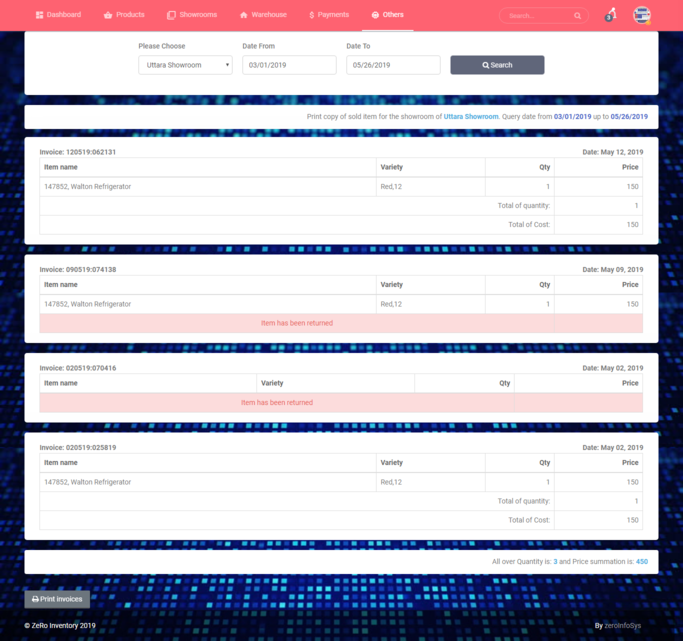 An admin can have every single option without having any kind of coding knowledge. Admin can see all reports including daily sales at several showrooms, daily income, daily profiles, return product items & much more. Warehouse Managers can deliver products to any showrooms or to a wholesaler with payment details. He can see single product quantities at several showrooms. Which showroom sailing how much and to whom etc. details. Can accept payments from wholesalers and much more. Showroom Managers can sell retail items to general consumers with tow options.