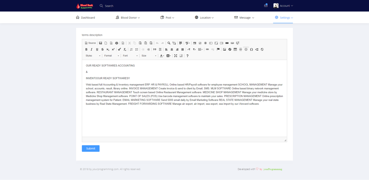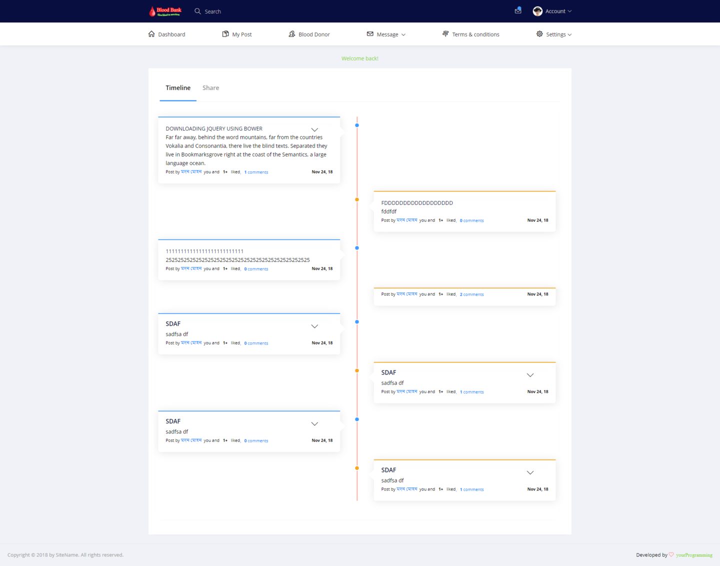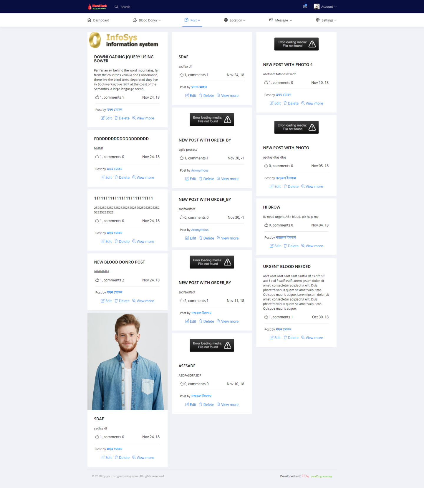 ‘Blood bank with social media’ is a web page platform. It will work as social media as well as blood bank. The system will collect blood donors & gave them an individual account for further activities. I normal blood donor can share this post over the system & system will show his/her post to all other members of the system. When a user/blood donor share his/her post, it will show a category, one is ‘general share’ for sharing opinion or status of mind and second one is ’blood related’. When a user share his/her post & if it is blood related post, one blood group will be selected by the user & then, system will sent a general message to all other users/member about this urgency of blood. This how a normal user can share his/her post and also can get blood donors if needed. We made this fully responsive so that every device can get an access. We use Codeigniter as a framework. It`s the most popular framework of php around the world. In the system an admin can manage complete website without having single line knowledge of coding or programming. This System allows multiple admin and unlimited members, posting, commenting etc. When a user request to be the member of the system. It will controlled by the system via emailing & for further it could be integrated with SMS getaway.