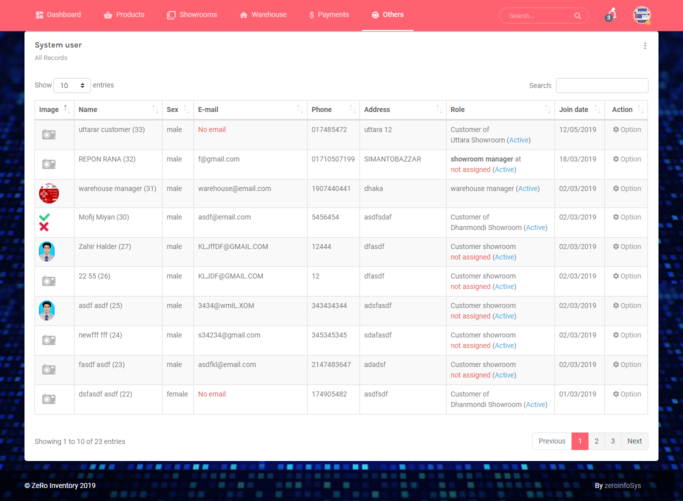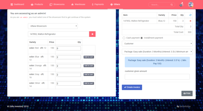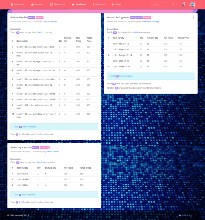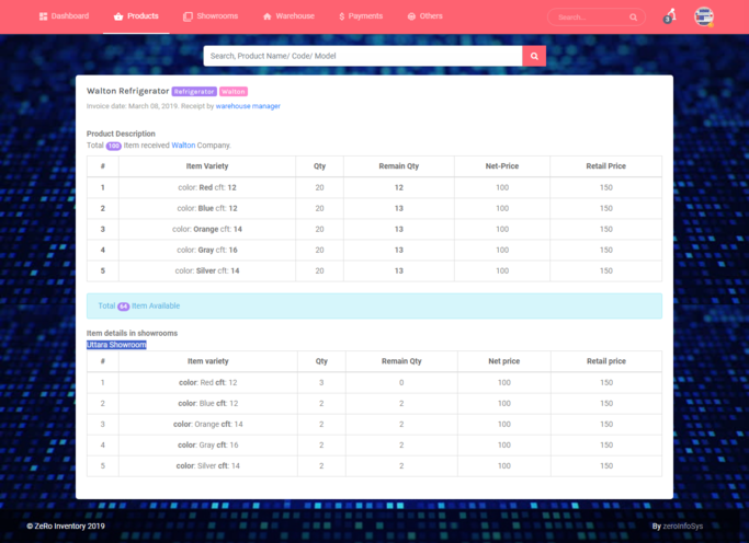 An admin can have every single option without having any kind of coding knowledge. Admin can see all reports including daily sales at several showrooms, daily income, daily profiles, return product items & much more. Warehouse Managers can deliver products to any showrooms or to a wholesaler with payment details. He can see single product quantities at several showrooms. Which showroom sailing how much and to whom etc. details. Can accept payments from wholesalers and much more. Showroom Managers can sell retail items to general consumers with tow options.